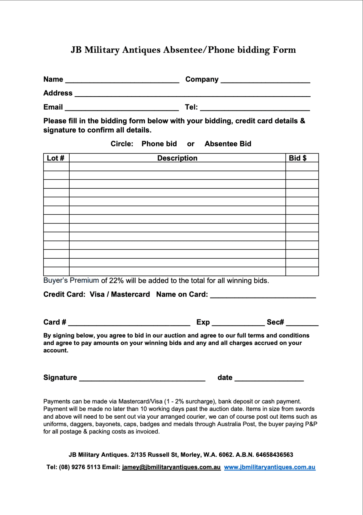 Absentee/Phone Bid Form Please contact us on +61892765113 or use our contact form here if you have any questions. All lots are guaranteed authentic unless otherwise described and come with a 90-day inspection/return period. Download Absentee/Phone Bid Form