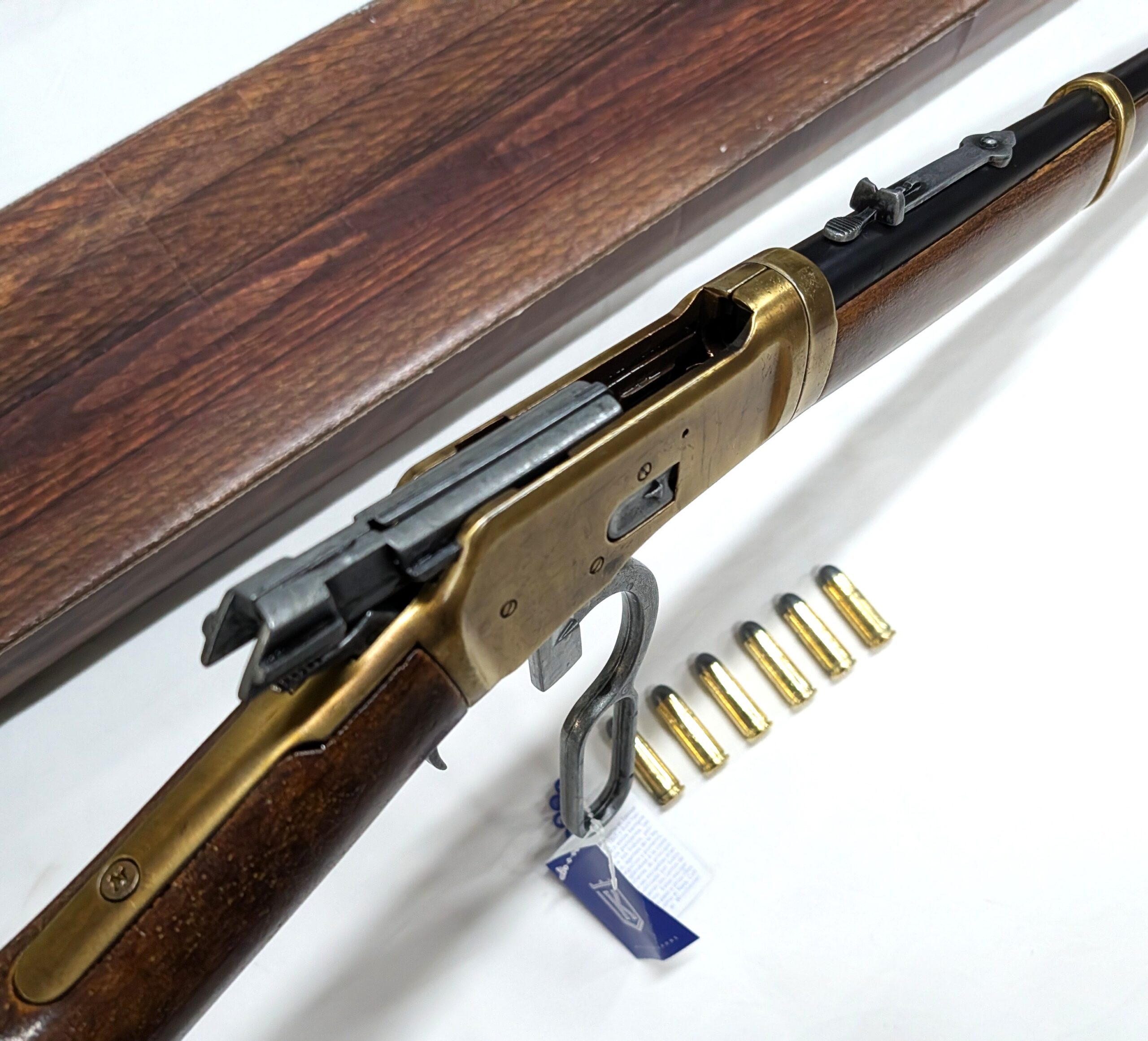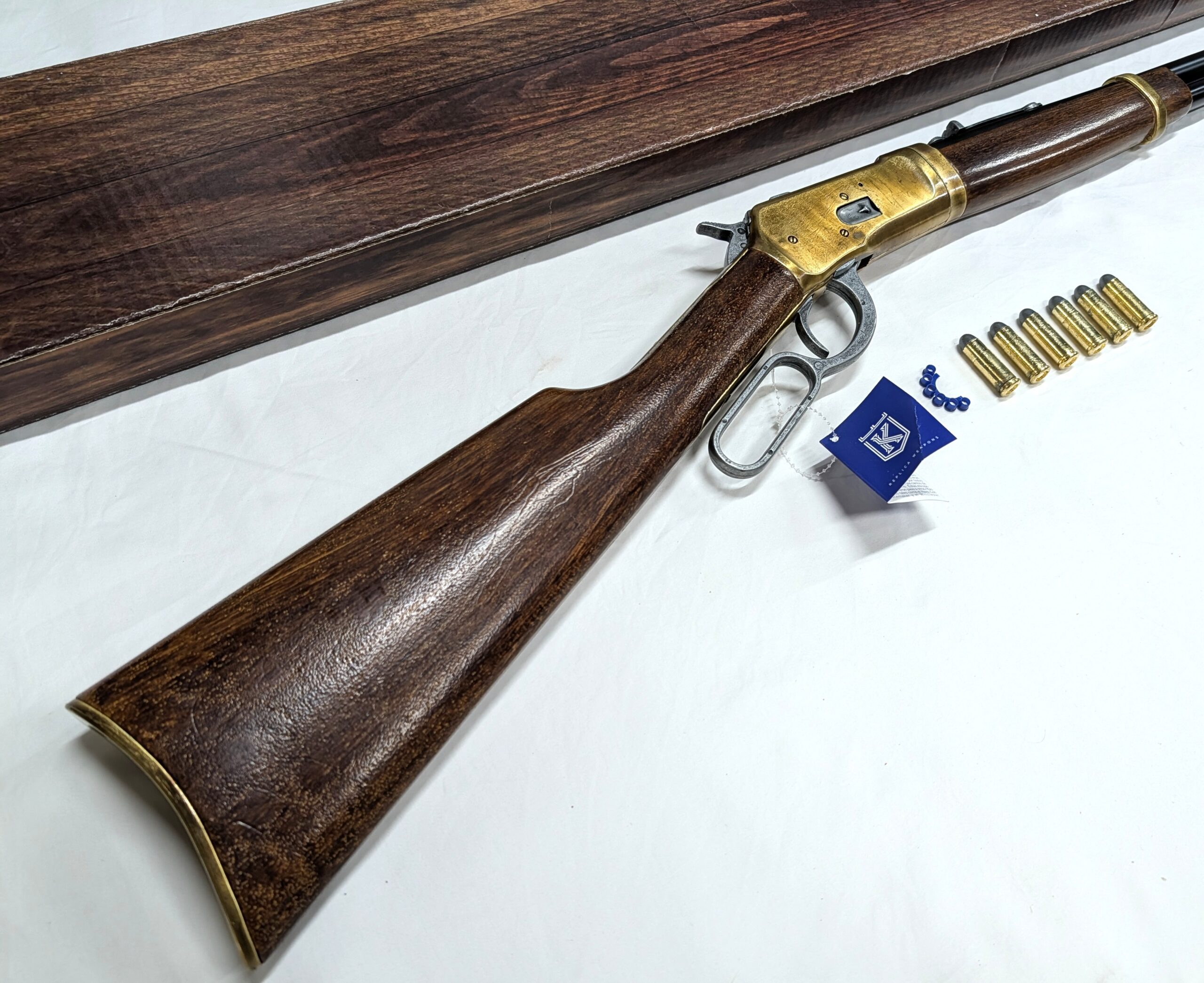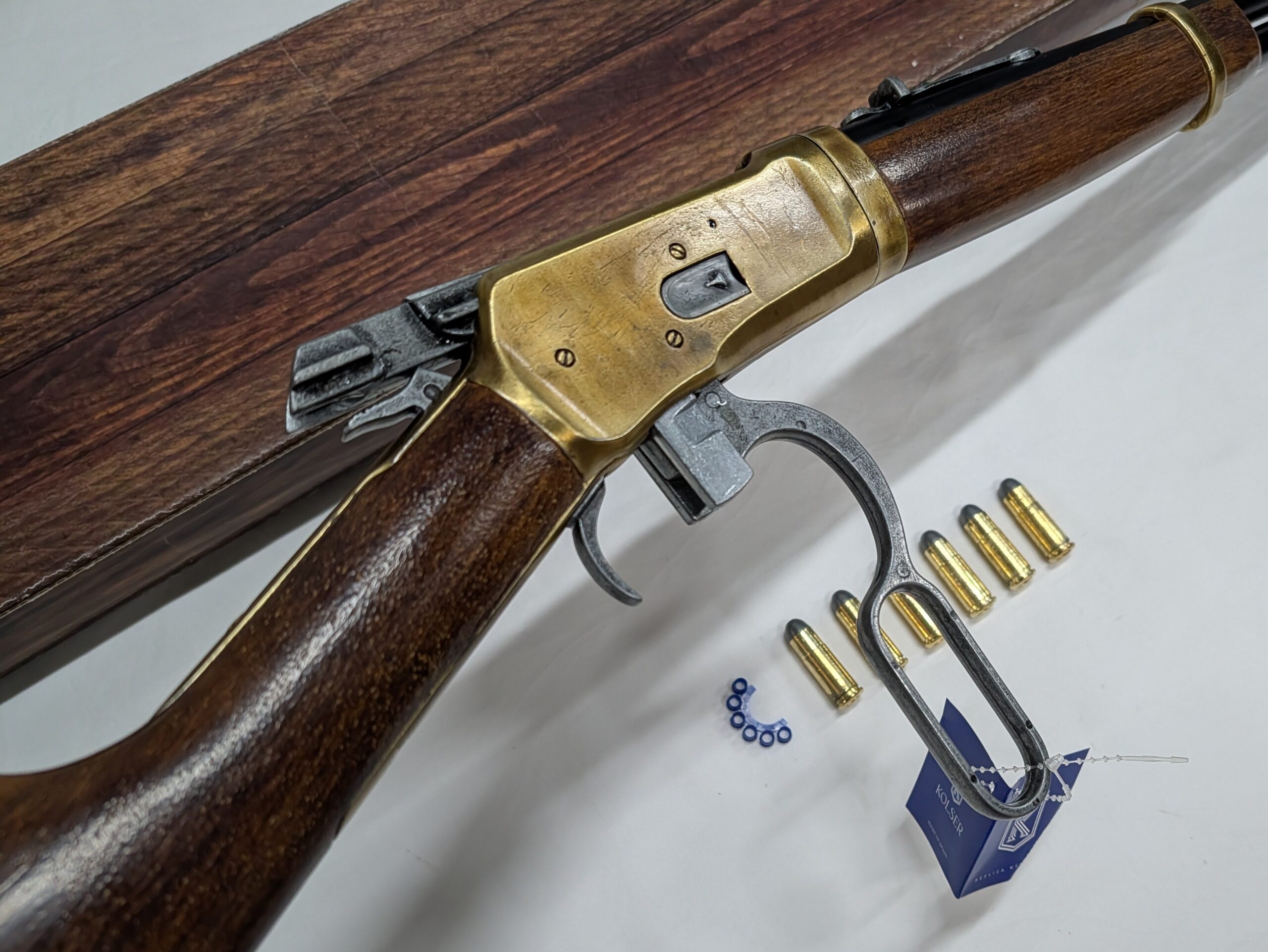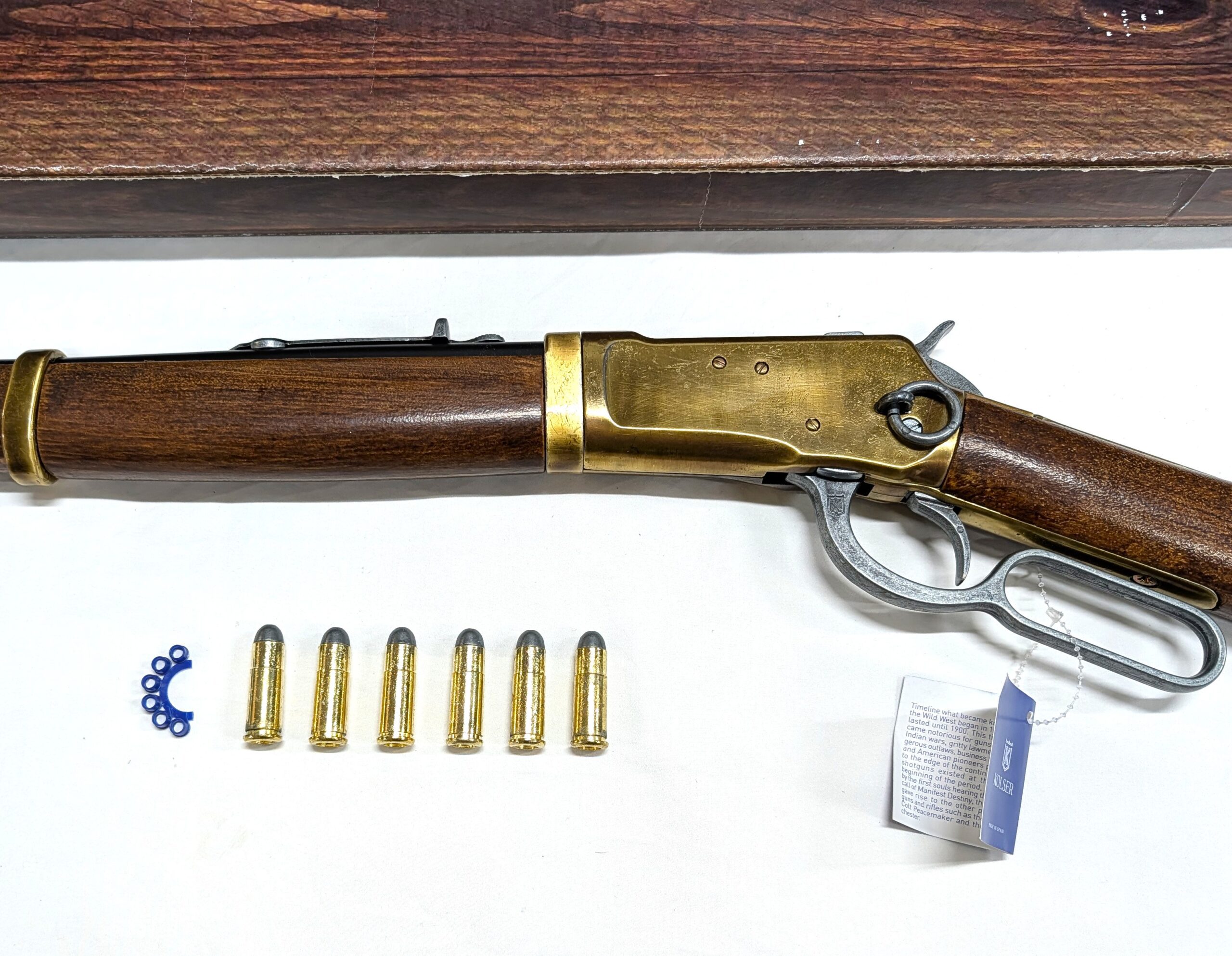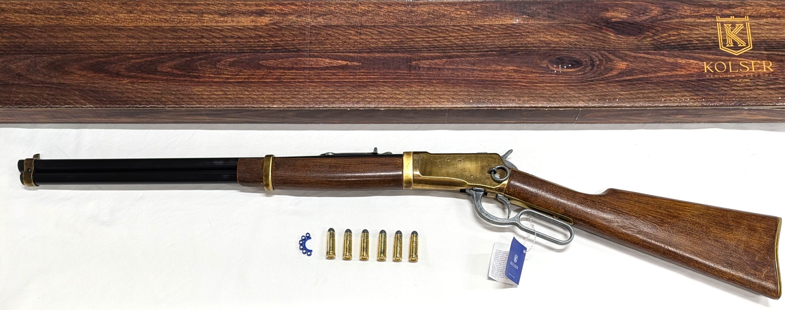 The Kolser replica Winchester Rifle has a functional mechanism and a reloadable chamber for chambering the Kolser-manufactured replica bullets that come with each rifle.