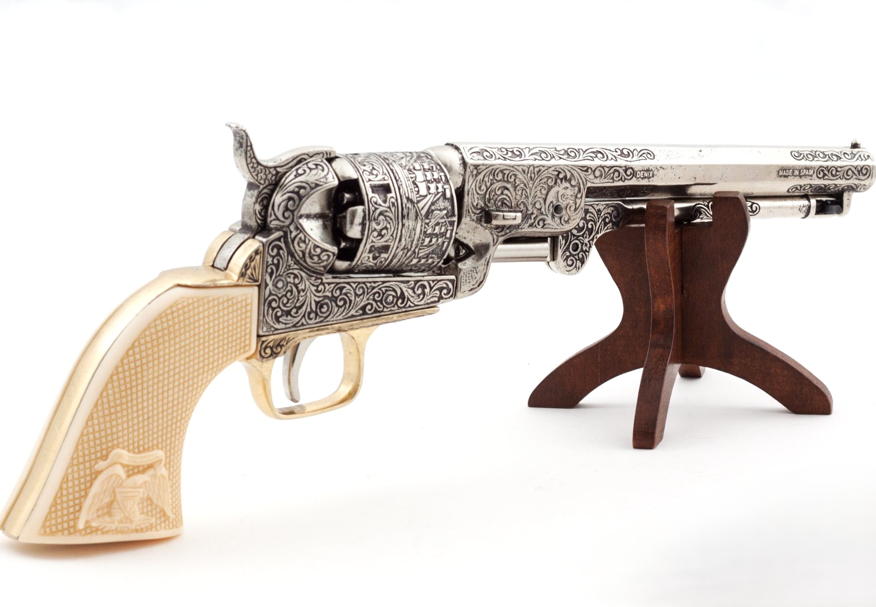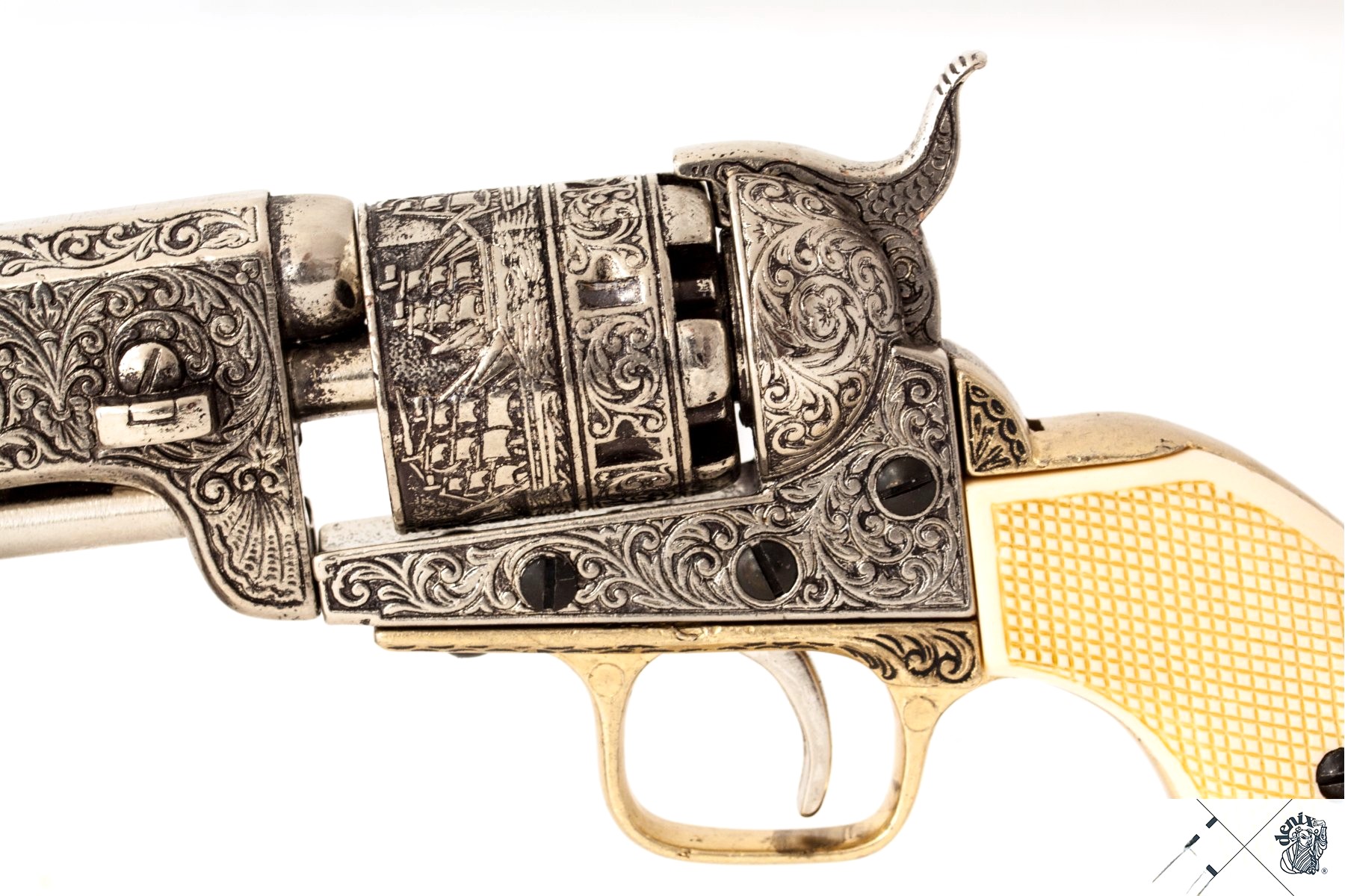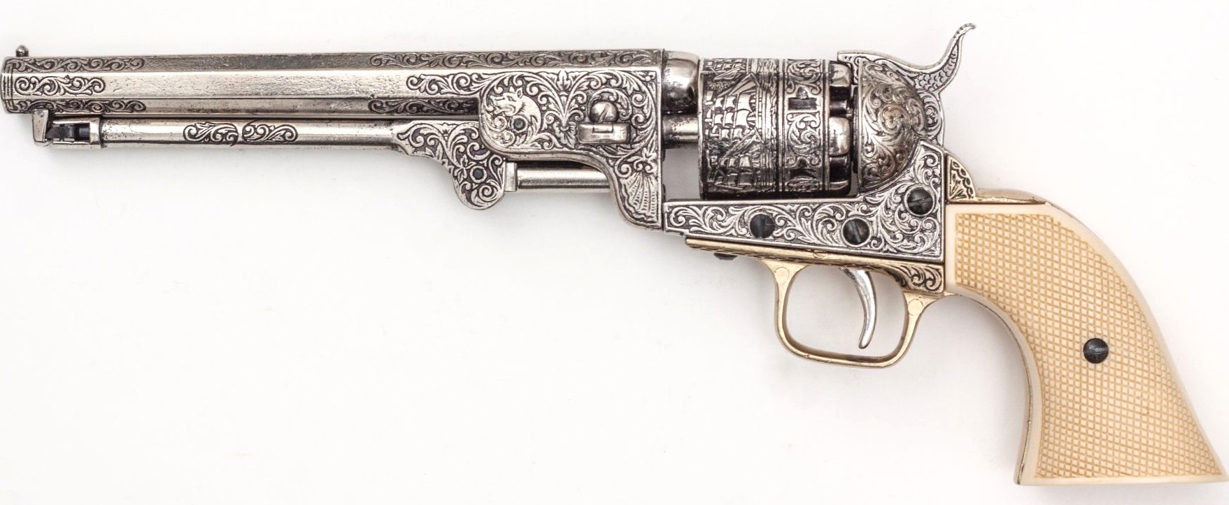 A superb Denix copy of the 1851 Navy colt with Naval battle scrollwork and real faux ivory grips and cast scrollwork to the metal parts.