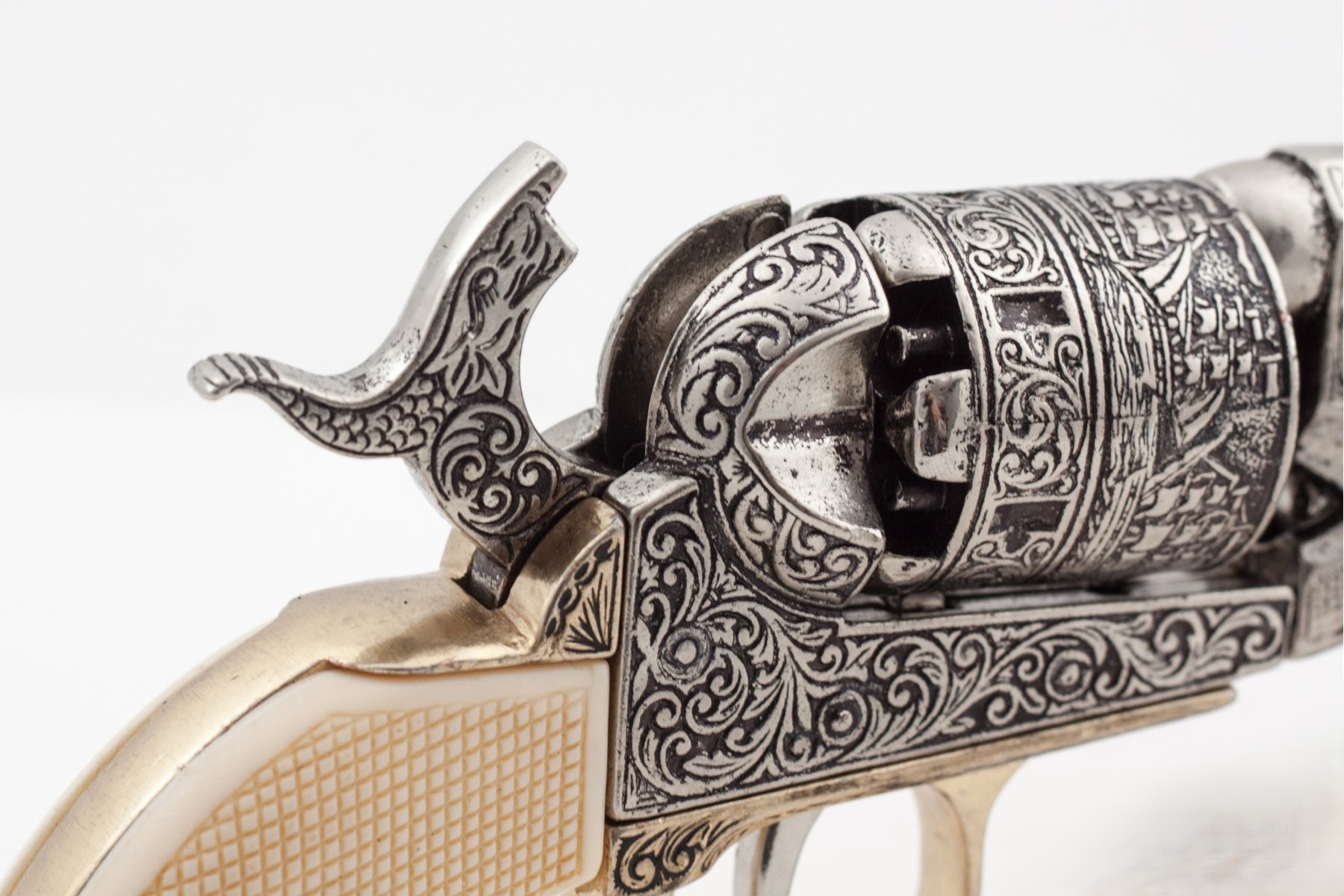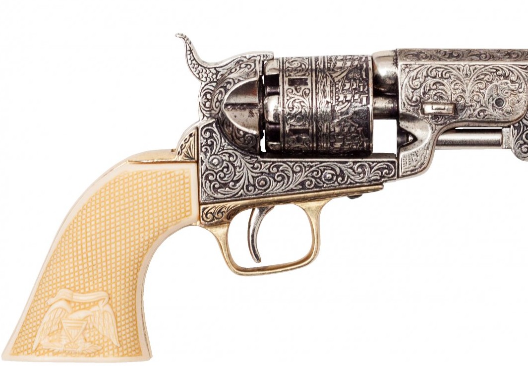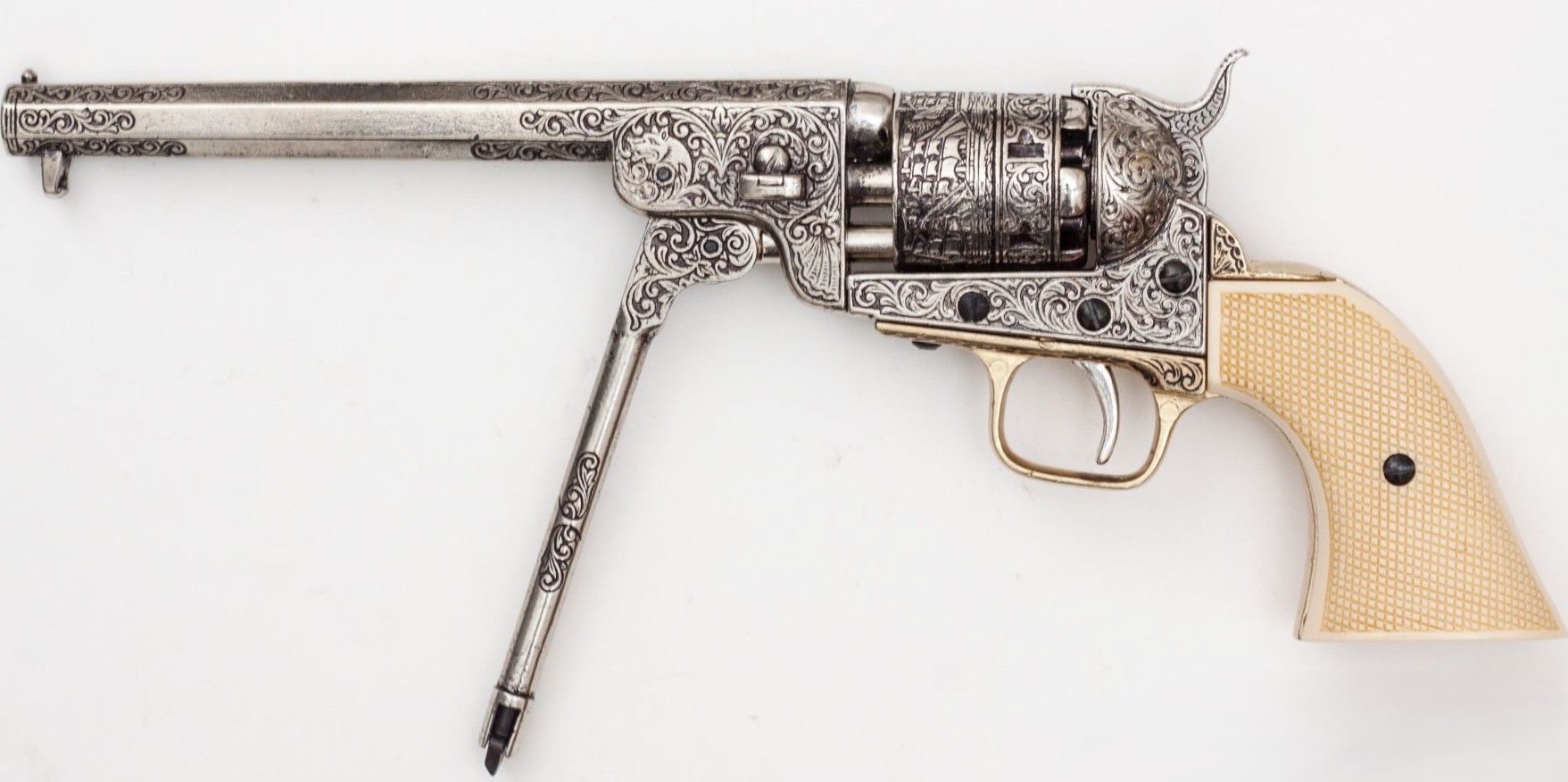 On this Replica, the functional mechanisms add even more authenticity; work the hammer, trigger, and rotate cylinder just like the original – The cylinder of this revolver is engraved with a scene of the victory of the Second Texas Navy at the Battle of Campeche, while the frame features elegant scroll work.