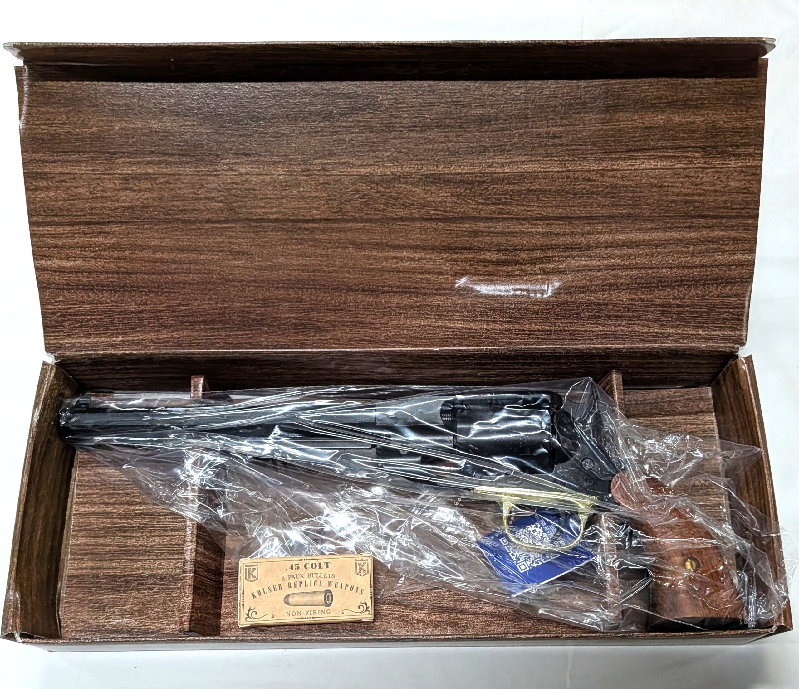 As cap-and-ball revolvers became outdated, many models were adapted to fire metallic cartridges. Kolser faithfully recreates the Remington 1858 Converted, featuring a modified cylinder and rear-positioned hammer. This replica is not just decorative: it’s designed with a functional mechanism that reproduces the original firearm’s movements simulated firing.
