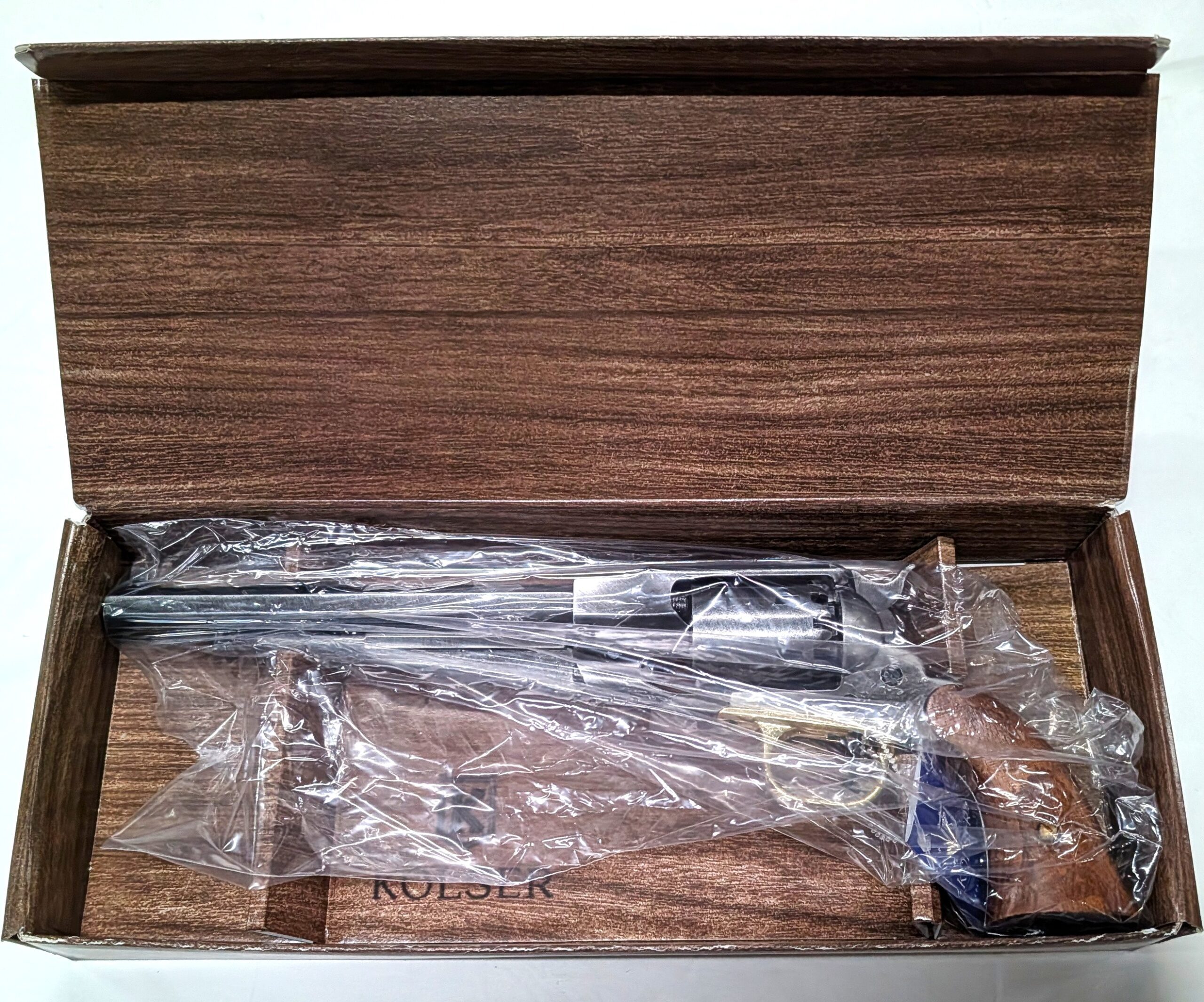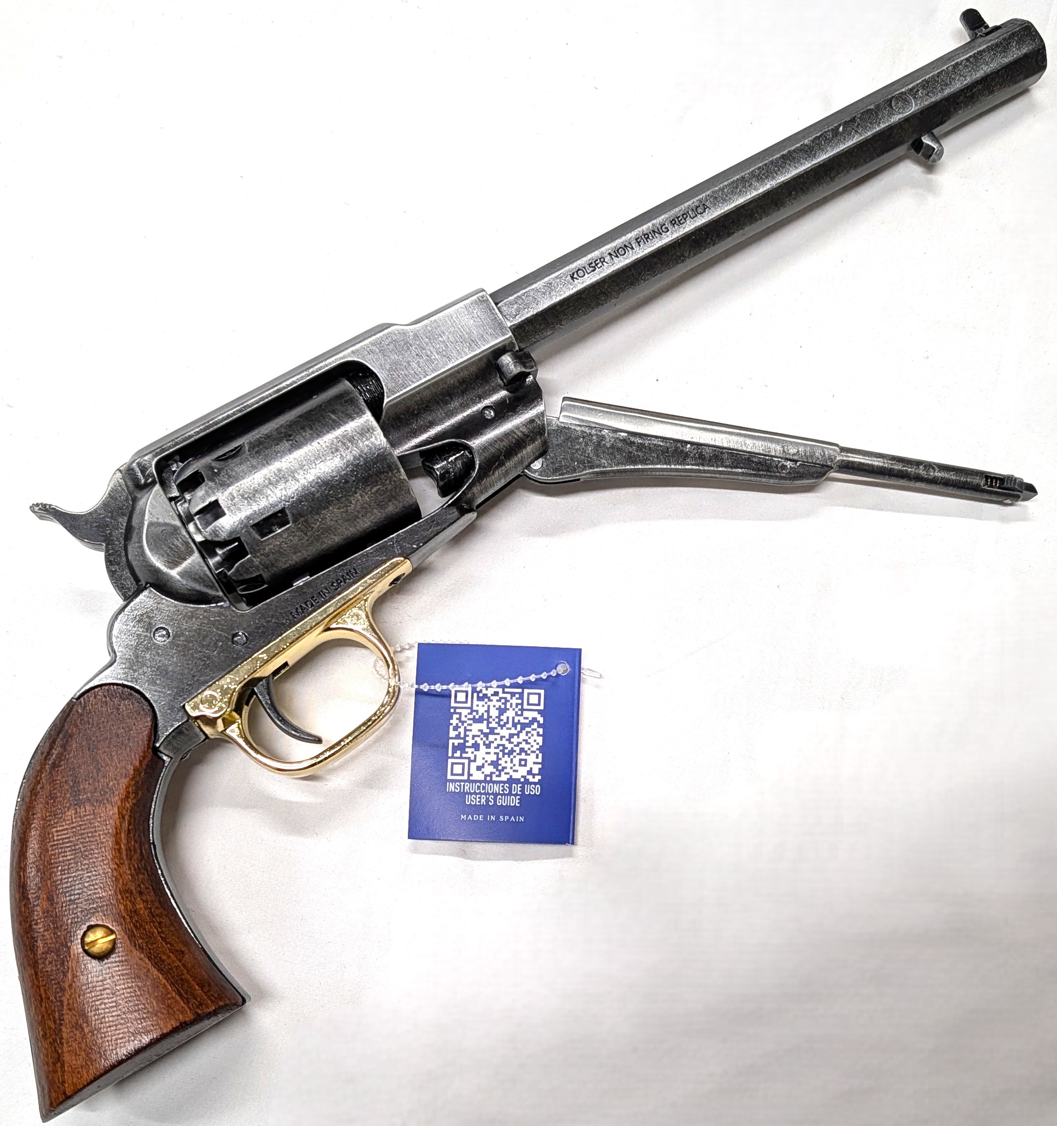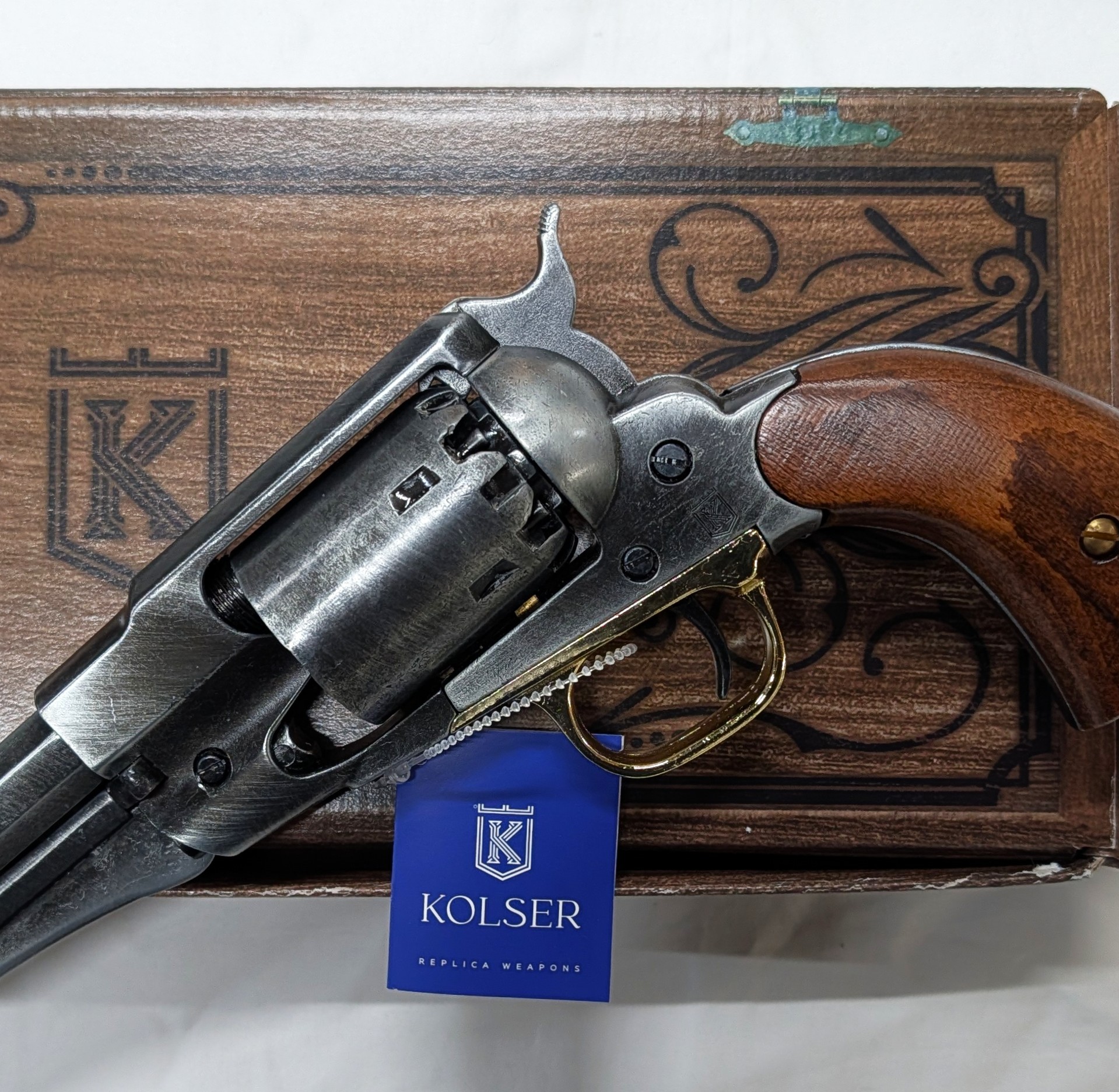 Discover the Remington 1858 replica, the most authentic non-firing reproduction of the iconic percussion revolver that transformed 19th-century military firearms. Crafted from high-quality materials with realistic finishes, this Kolser replica stays true to the original design — from its solid frame and removable cylinder to its distinctive octagonal barrel. Its weight and dimensions are carefully matched to the original, delivering a hands-on experience that feels as real as it gets. The revolver features a functional mechanism with simulated firing action, closely mimicking the original movements.