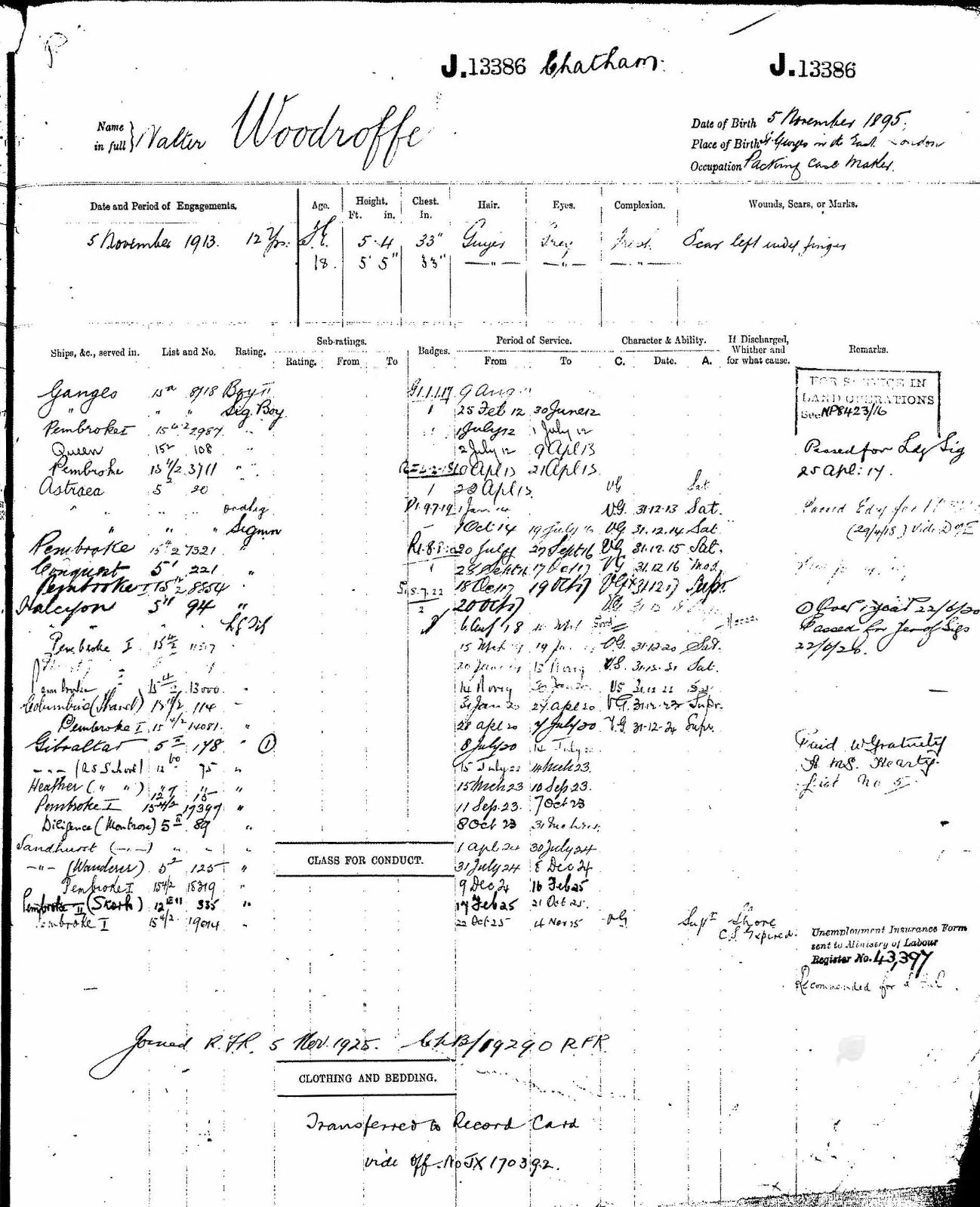 Leading Signaller Walter Woodroffe was born in St. Georges, East London in 1895. A packing case maker by trade he enlisted into the Royal Navy as a Signal Boy 2nd Class on 25/2/1912.