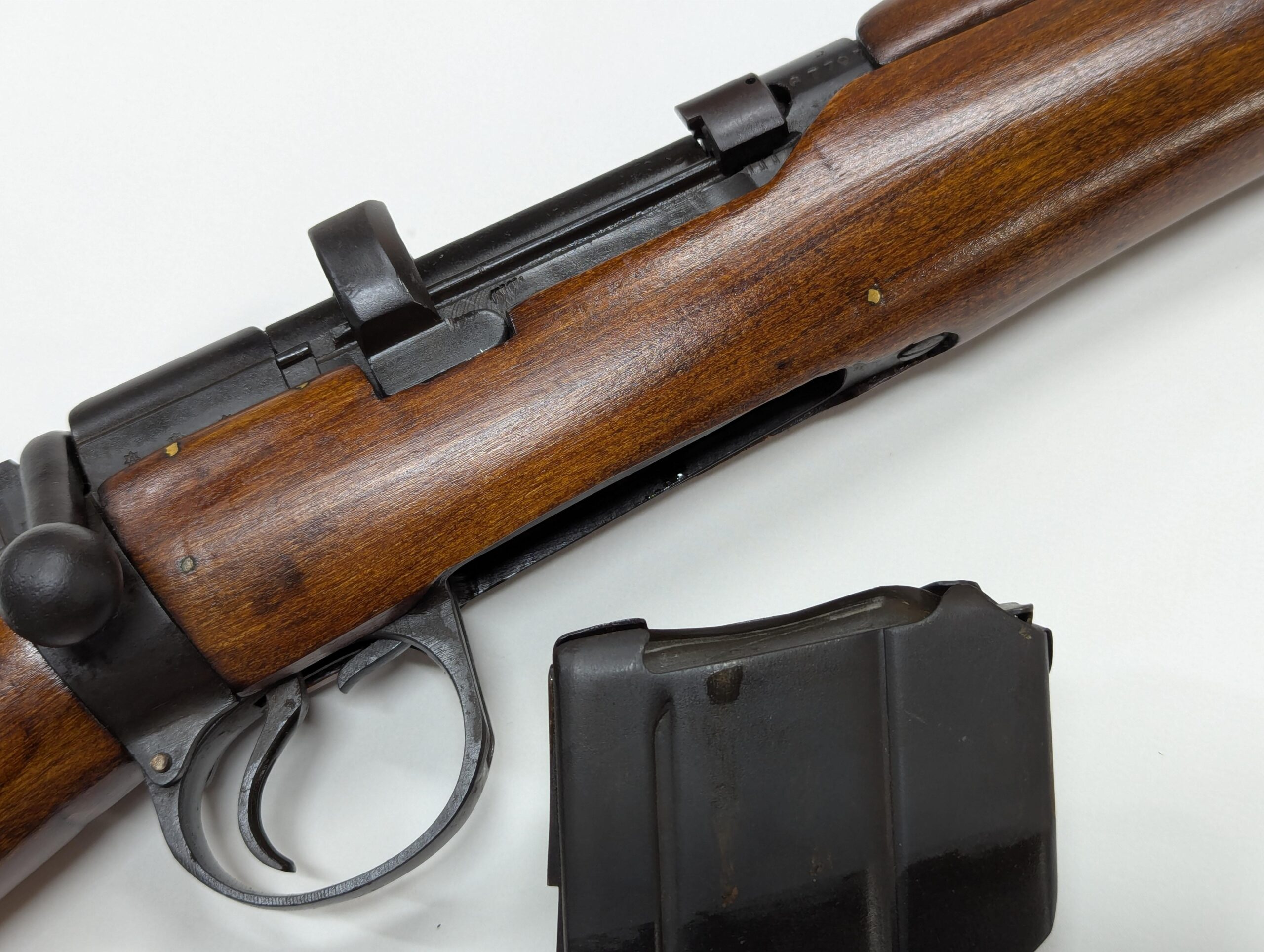 WW2 Australian 1942 dated, inert/deactivated Lee Enfield No.1, Mk.3 rifle by Lithgow Small Arms. An excellent example of this iconic service rifle, which has been deactivated for display. Marked ‘MA S.M.L.E. III 1942′ to sleeve. The bolt is fixed, working trigger and removeable magazine. Serial numbers to various parts are matching. Overall, an excellent display piece. Note: No licence required in W.A. JB Military Antiques can ship this lot within Australia, Bidders from outside of Australia must arrange for collection and shipping of this lot.